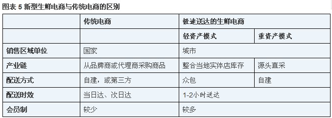 与传统电商相比,这种极速送达的新型生鲜电商有着鲜明的特点,主要体现在以下几个方面(如下表所示)。