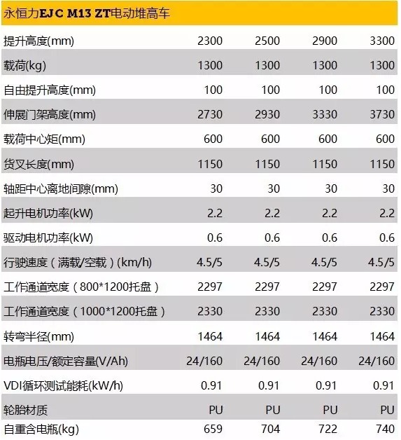 M系列又加入新成员——EJC M13 ZT,载重1.3吨的双门架电动堆高车。两级门架,四种提升高度可选(2300mm, 2500mm, 2900mm, 3300mm)。配备24V, 160Ah铅酸电池,可支持更长时间的工作。