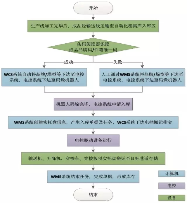 机器人码垛完毕入库申请时,电控系统将之前扫码读取到的成品件箱唯一码上报至计算机系统,计算机系统保存该入库实托盘的每一个成品件箱唯一码,以保证信息系统对货品的全过程跟踪及追溯。