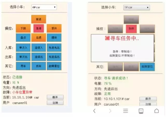 在物流项目中,物流载体通常使用条形码或电子标签以唯一标志及识读,掌上电脑PDA因可以扫描一维码、二维码及读写RFID芯片而备受欢迎。现在PDA主要有WinCe、Windows、安卓系统等,APP在各种系统平台之间不能够通用。ServiceApp应用服务具有跨平台的通用性特征,通过提供相应的WebForm界面,并发布至应用服务器的IIS,PDA、计算机、平板电脑及手机(安卓或IOS)均可通过IE浏览器访问相应页面,以完成组盘入库、出库分拣等人机交互业务,也可遥控和指挥穿梭子母车完成货物移载、设备启停等动作。ServiceApp应用服务层的页面展示如图6。