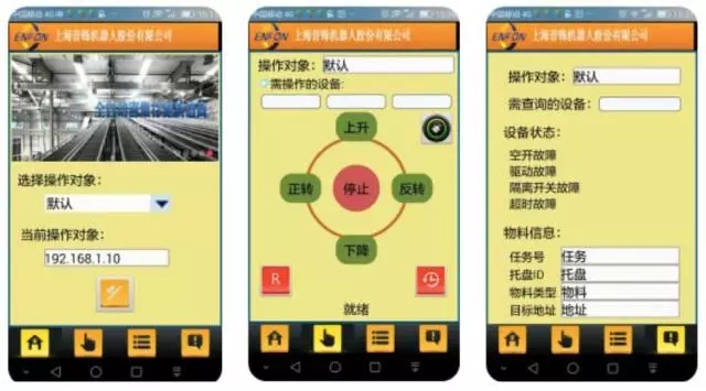 现今,人工智能在自动化物流领域内得到愈加广泛的重视,并在机器人、控制系统、仿真系统中得到应用。基于安卓系统开发,具备设备操作、故障查询、输送任务查询、异常复位等功能的移动终端APP,大大提高了设备操作和维护的便捷性和安全性。操作员可通过无线4G等随时下载最新版本,随身携带,就近操作设备。移动操作终端界面,如图10。