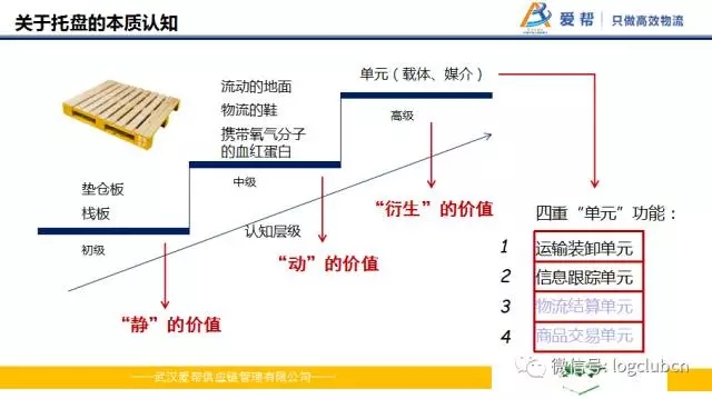 但其真正价值在于“动”,如果托盘能随货物一起出仓、进车,并在下游回收再利用或在整个供应链内连续循环使用,那么它就不辱使命了;如果在“动”的价值上做衍生,你就会把托盘视为一个“空间单元”(或叫载体、媒介),包含四重“单元”功能: