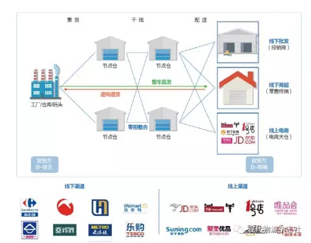 节点针对不同客户的不同痛点提供一体化解决方案,一是线下商超,以上海为例,其营业点将近一万,具有典型的多分散、高频次、小批量、短距离等特点,对物流人员和线路的稳定性以及交接、退换货的稳定性要求较高。节点通过与各区域运营能力较强的物流企业合作,在提升业务量的同时赋予智能化决策的能力。二是针对电商,现今电商大仓的交接,正向交接相对容易,电商的痛点在于逆向物流,要求物流的每个环节信息做到高度协同和精准。节点以仓库为核心点,围绕着电商布局。目前电商大仓的布局是集中在七大城市,北京、上海、广州、成都、武汉、西安和沈阳,占整个电商市场份额的80%左右,节点围绕电商业务七大城市设置仓库,提升正向物流的效率同时完成逆向退换货的作业。