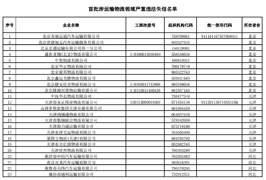 为落实社会信用体系建设部际联席会议有关部署,加快推进运输物流行业信用体系建设,根据《国务院关于建立完善守信联合激励和失信联合惩戒制度加快推进社会诚信建设的指导意见》、《关于我国物流业信用体系建设的指导意见》、《关于对运输物流行业严重违法失信市场主体及其有关人员实施联合惩戒的合作备忘录》等文件要求,在国家发展改革委经济运行调节局指导下,全国信用信息共享平台整理形成首批涉运输物流领域严重违法失信名单。