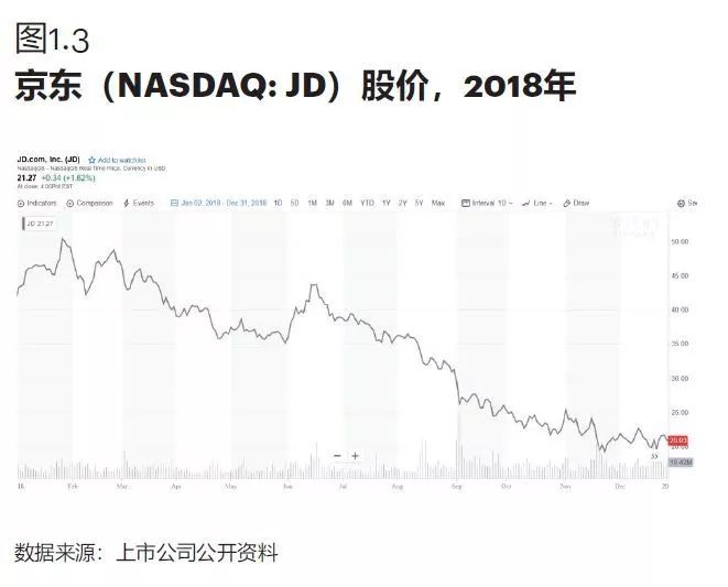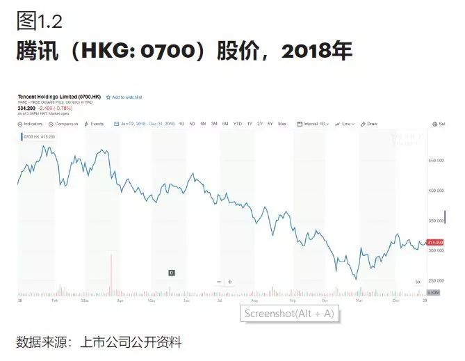 例如,在过去十年已成共识的“消费升级”概念外,延伸出了“消费降级”“消费分级”的讨论;资本寒冬来临,互联网创业环境变化,许多新经济概念(如共享单车、无人货架、ICO等)经历了从巅峰到崩溃的大起大落;此外,明星科技股价亦剧烈波动(图1.1-1.3),反应出市场的焦虑与不安。