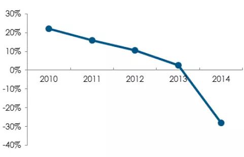 大型仓储企业的重资产比例较高,其中自有仓储面积占到总仓储面积的77.6%。较高的重资产导致企业的流通灵活性差,2010-2014 年,企业总资产周转总体下滑。同时,过高的总资产导致行业总体ROE 偏低,虽然国家出台多项政策支持、政府补贴和出售资产等营业外收入使得国有大型仓储企业ROE 改善,但是企业经营仍然处于困境,2014年大型仓储的主营营业收入处于-28%的增长率;