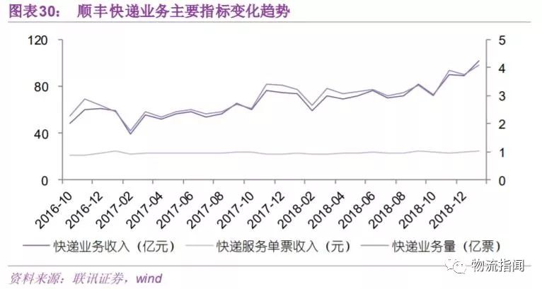顺丰业务始终位于中高端业务领域,公司的业务量增速较其它头部企业要低,但是仍然能够超过行业平均水平。公司业务量占行业比重不到8%,但是收入规模却占到行业的15%。公司在中高端业务领域具有良好的服务水平及其带来的品牌效应,伴随电商快递策略的调整,在整个行业的市占率在2018年有所回升。