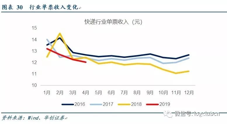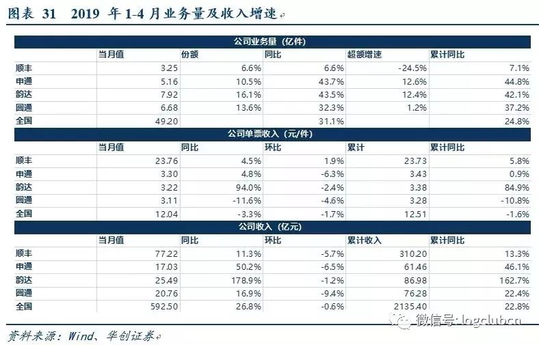 2019年更为明显,龙头增速远超行业,1-4月累计增速看申通(44.8%)>韵达(42.1%)>圆通(37.2%)>行业(24.8%)>顺丰(7.1%)。