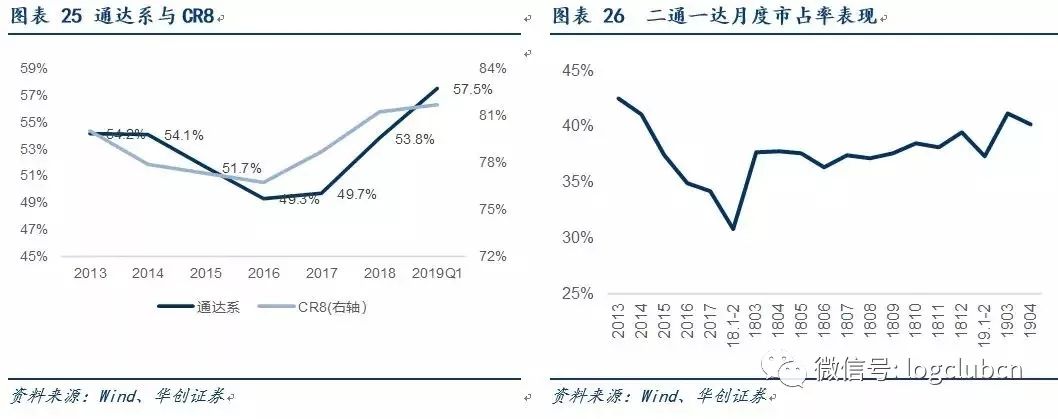 龙头集中趋势明显:通达系市占率16年后见底回升,18年起加速上行。