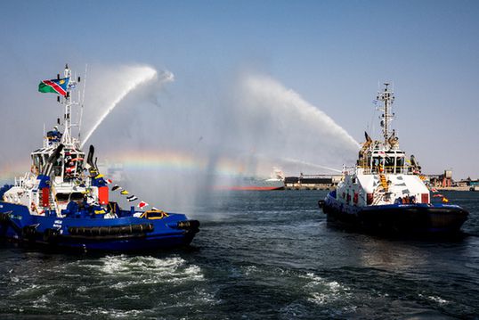 在纳米比亚沃尔维斯湾新集装箱码头竣工仪式上,消防船用水柱搭建起“水门”庆祝。记者 张宇 摄