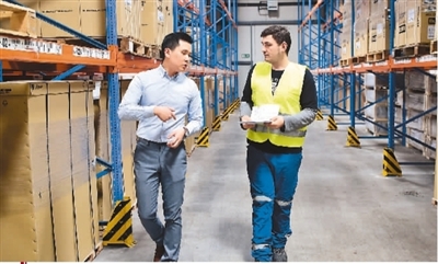 在德国杜伊斯堡渝新欧(重庆)物流有限公司的物流仓库,公司商务主管甘宇辰(左)同一名外籍雇员进行业务沟通。