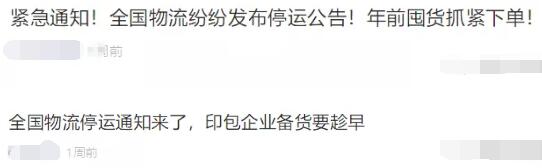 步入12月份以来,业内各大媒体平台陆续转载物流停运通知,称“全国物流纷纷发布停运公告,年前囤货抓紧下单”、“全国物流停运通知来了,印包企业备货要趁早”,然而这不过是一个谣言,部分媒体只是在以讹传讹罢了。