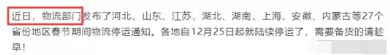 近日,一张全国物流停运通知在业内各大媒体平台上流传,其中标注了全国各地物流的停发日期。然而实际上,这不过是个谣言,每到年终就会上演,成为部分企业的营销手段。