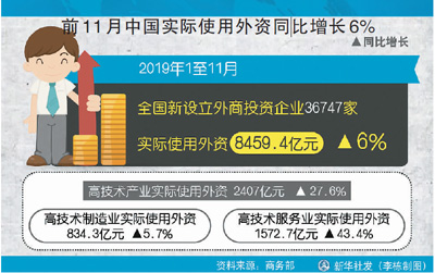 今年前11月,全国新设立外商投资企业36747家,实际使用外资8459.4亿元人民币,同比增长6.0%,在全球投资贸易低迷的情况下成为一抹亮色。专家指出,随着以外商投资法为代表的系列组合拳落地,进入2020年,外商来华投资兴业将再迎利好。