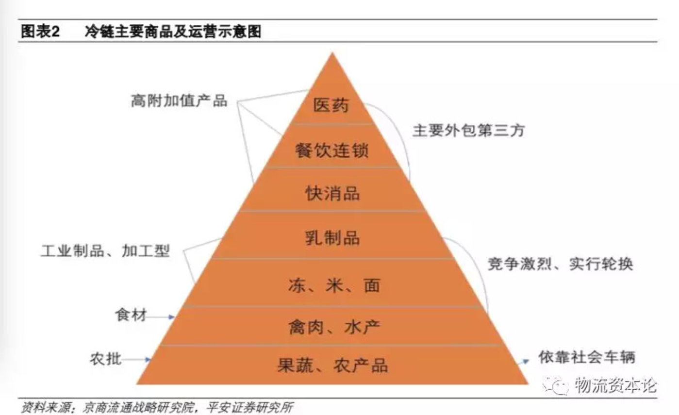 冷链物流下游需求中以食品为主,食品又分为农产品、禽肉、乳制品等细分产品,物流资本分析师根据《制冷技术》数据,食品冷链占冷链物流的比重接近90%,是冷链物流最主要的运用。