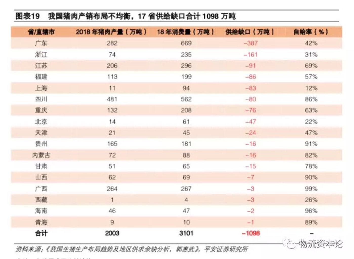 我国猪肉产销布局不均衡,17 省供给缺口合计 1098 万吨。我国生猪产区和销区布局极不均衡,如 猪肉消费大省广东,估计 18 年消费量约 669 万吨,但猪肉产量仅 282 万吨,缺口 387 万吨需从外 省调入,估计全国 17 省供给缺口共 1098 万吨。