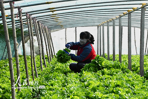 河北省邯郸市永年区西河庄乡河西堡村的大棚里,农民正在管理、收获蔬菜,以保障疫情防控期间居民生活必需品的供应。胡高雷/人民图片