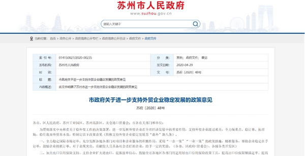 4月29日,江苏省苏州市政府发布《关于进一步支持外贸企业稳定发展的政策意见》,指出要加大出口信用保险支持,对全市小微企业投保短期出口信用保险实行阶段性降费,进一步扩大市级中小微企业出口信用保险统保平台覆盖面,将上年度海关统计出口额30万美元以下的外贸企业纳入市级统保平台,实现对年出口额1000万美元以下统保平台内企业短期出口信用保险费用由政府全额扶持。