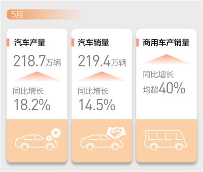 中国汽车工业协会6月11日发布的数据显示:5月我国汽车产销分别达到218.7万辆和219.4万辆,同比分别增长18.2%和14.5%,增速高于上月15.9和10.1个百分点。其中,商用车产销同比增长均超过40%,连续11个月下滑的乘用车产销由负转正,分别增长了11.2%和7%。