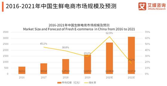 而作为阿里巴巴新零售的样板工程,阿里旗下的盒马鲜生最具代表性。据艾媒咨询公布的《2016-2021年中国生鲜电商市场规模及预测》报告,2019年中国生鲜电商市场规模保持29.2%的稳定增长,达到1620.0亿元,预计到2020年将升至2638.4亿元,同比增长62.9%。但是,不容忽视的是,生鲜总体的市场容量在万亿级别,而目前生鲜电商的渗透率仅仅百分之十几。由此可见,尽管有阿里、京东等巨头进驻,生鲜电商的市场份额,仍待突破。