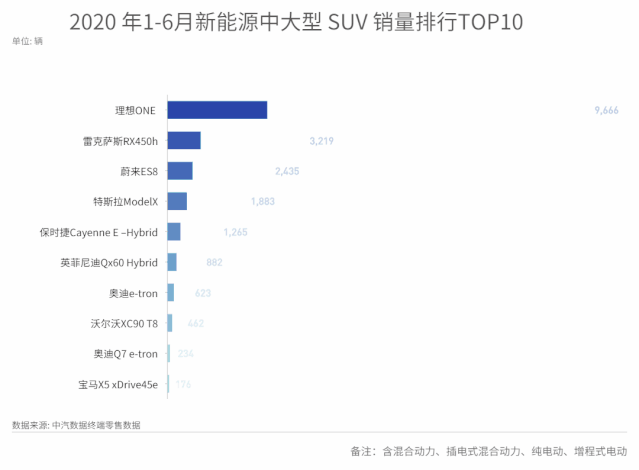 理想汽车冲击IPO的底气来自于日渐稳定的销量数据。根据中汽数据终端零售数据,在2020年1-6月新能源中大型SUV销量TOP10中,理想ONE以9666辆的绝对优势超越雷克萨斯和蔚来位列第一。