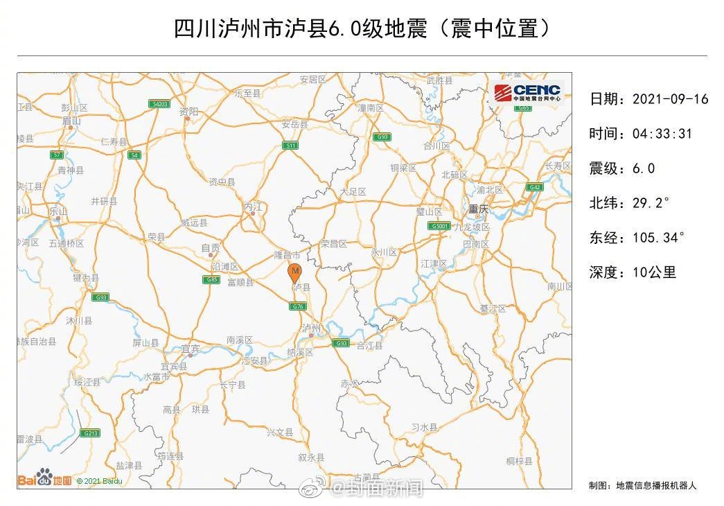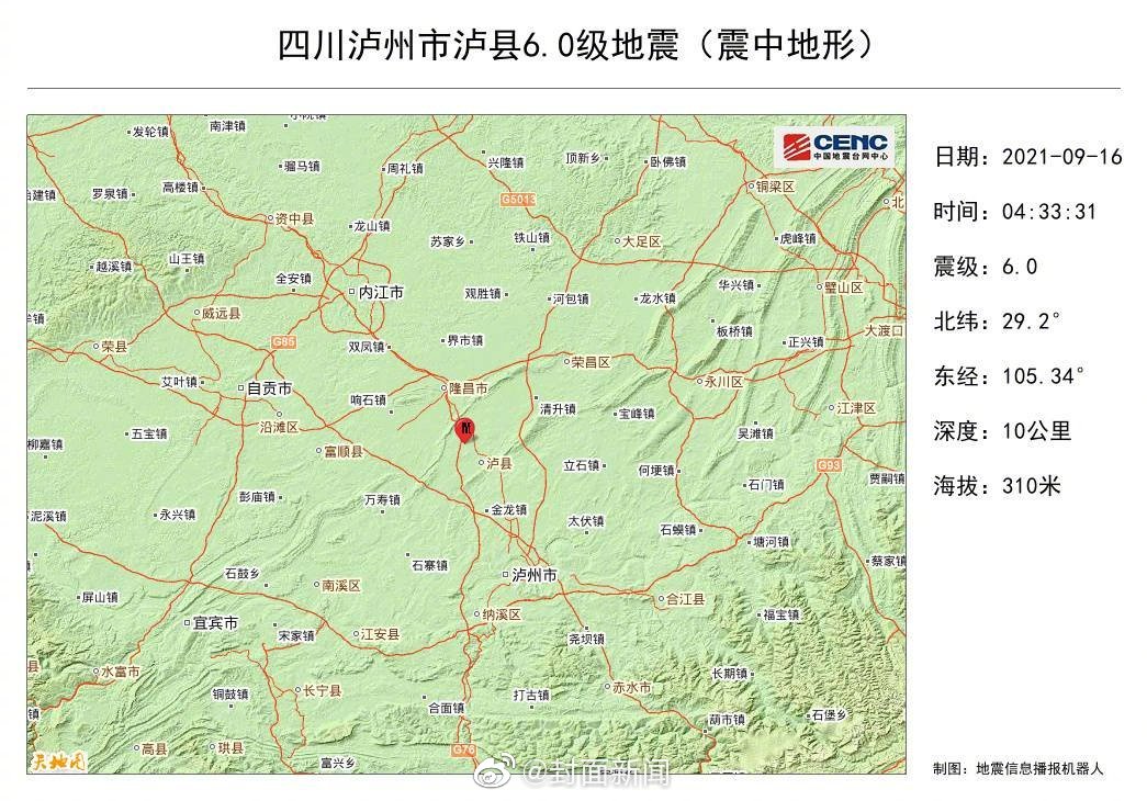 中国地震台网正式测定:9月16日4时33分在四川泸州市泸县发生6.0级地震,震源深度10千米。据四川泸州市宣传部消息,截至7时30分,地震导致死亡2人,重伤3人,轻伤57人,转移安置6904人。目前泸县全县居民房屋倒塌35处、严重损坏188间,1处车站受损。