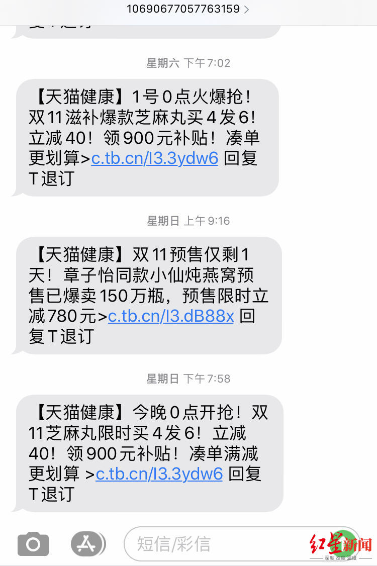 这天晚上,“双十一”促销活动正式开启。周燮在头部主播薇娅和李佳琪的直播间来回跳转购买,与直播间疯狂上涨的成交额一起,各大电商平台的营销短信也蜂拥而入。与周燮有同样烦恼的人不在少数。“(垃圾短信)太多了,我也懒得清理。”和记者聊天时,余翡打开手机短信箱,显示的未读信息有2000余条。她一条条划过,除重要信息外,9成以上都是电商平台的营销短信。除“双十一”促销活动,其他电商促销活动期间的营销短信也有不少。疯狂轰炸的营销短信给她带来不少困扰。比如,做销售的她经常会因此遗漏掉客户的重要信息。她也曾为此向平台进行过投诉,“平台回复大都敷衍。如果要彻底解决,只能挨个儿一家家自己去找店家沟通。”但商家太多,后来她也就此作罢。周燮也曾试着和店家挨个儿发信息沟通,有些商家将其解释为是在为她提供信息和优惠,并不认为这是“垃圾短信”。也有商家告诉她可以选择“回复T退订”或手机设置垃圾短信拦截功能,但她依然收到了营销短信。不止是营销短信,前两天,成都人谢澍还接过一个来自杭州的座机电话。接通后,电话那头传来一个男声,通知他某某电商店铺有活动,邀请他参与。那时他正在参加一个学术会议,听到后没好气地回了句“不需要”就掐断了电话。对于此类营销信息,记者对话的5位受访者,不约而同将其界定为“垃圾短信”。平台: