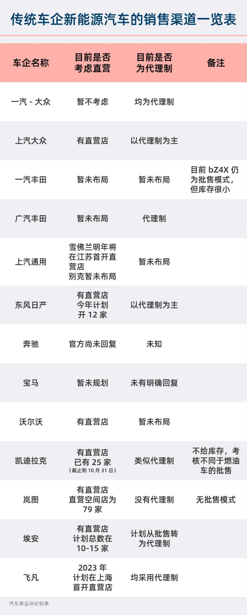 目前,据汽车商业评论了解,上汽大众已在上海开出了第一家 ID 直营店,对应的一汽 - 大众暂时还没有直营计划。一汽丰田和广汽丰田同时开始销售 bZ4X,网络仍使用原有的经销商体系,不同的是一汽丰田仍沿用燃油车的批售模式,而广汽丰田则改为了代理制。东风日产随着 Ariya 艾睿雅上市,也已在上海等一线城市开出了自己的直营店,同时原有的经销商网络在电车销售中都改为了代理制。