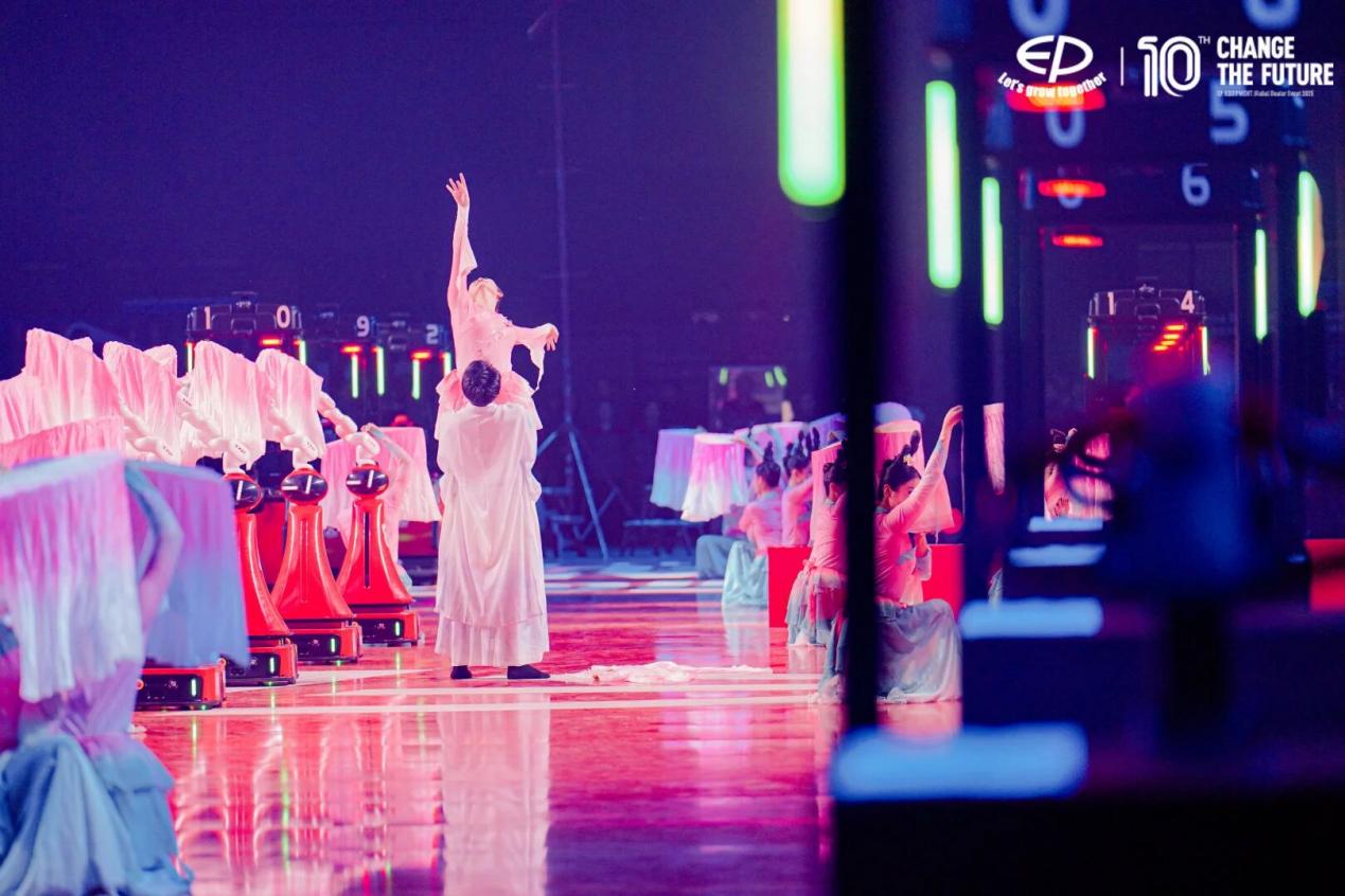 聚光灯下,中力搬运机器人和具身机器人灵动起舞,或缓或急,或起或落,与身着水袖的舞者共同演绎穿越时空的《梁祝》。机械臂的每一个起落,都与旋律精准契合;科技的光影与舞者的水袖,在舞台上交织出一幅流动的千年画卷。