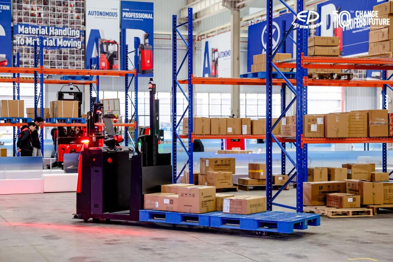 以场景痛点驱动技术创新,双11现场,中力创新推出以低位智能跟随拣选车+AI搬运车打通拣选至发货区的智能搬运流程。