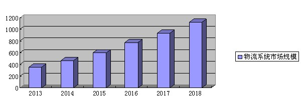 近年来,随着中国经济转型,带来了劳动力成本上升,土地大幅增至,从而引发了企业大规模建设物流自动化系统的热潮,物流系统建设加快,增长速速远远高于GDP的增长幅度,根据2013年物流系统规模增长与GDP的增长的弹性系数分析,已经达到1:3.8左右,因此可以预计未来年中国物流系统市场需求增长速度将达到年均29%,据我们估算,2013年中国物流系统市场总规模已经超过360亿人民币左右,到2016年将达到778亿元人民币,随着市场规模基数加大,2017年之后增长速度也会有所下降,增长速度将下降到20%左右,据此预测到2018年年中国物流系统市场规模将达到1000亿元以上,市场发展空间十分广大。具体如下表所示