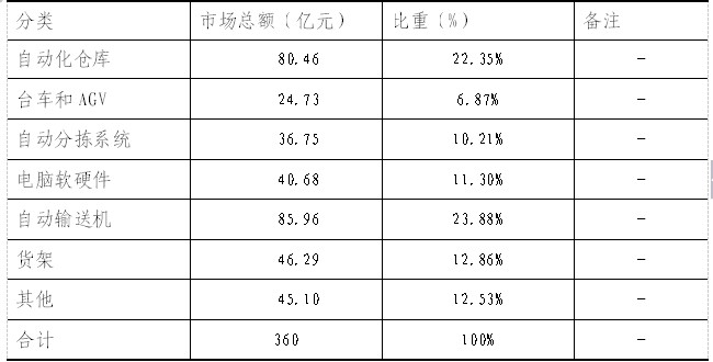 关于物流系统技术装备分类市场测算,我们根据日本物流系统设备的统计分析的比例结构,根据目前中国物流系统技术与装备的市场规模,可以测算出中国物流系统技术与装备的分类市场需求结构。根据日本物流系统协会近几年发布的统计报告分析,日本各类物流系统设备的应用比例如表6所示,参考这个比例,可以得出得到我国各类物流系统装备的市场份额,如表所示。