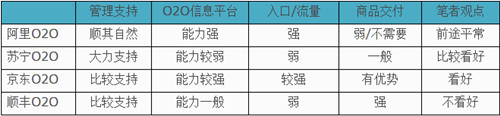 O2O的业务战略无论对于哪家公司,目前都还处于初期阶段。O2O对于阿里而言可能并未提升到战略层级,只是阿里平台“搂草打兔子”的扩展业务而已,能赚钱最好。对于苏宁而言则是企业成败之举,要么通过O2O转型成功,要么O2O成为吞噬苏宁的陷阱。对于京东,则是京东商城之外可以开城拓地的新业务,成功了可以景上添花;失败了,于京东商城本身并不会伤筋动骨。而对于顺丰,雄心勃勃的想通过顺丰优选进入电商行列,通过O2O扩大电子商务业务规模,重兵投入,结果却很难预料。结合O2O业务实现的难点分析,对以上四家O2O战略对比分析如下: