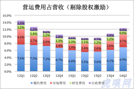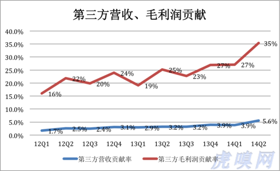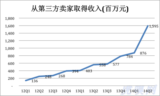 尽管第三方卖家对GMV的贡献已接近四成,但在营收中占比极小。2014年第二季度为5.6%,去年同期为3.2%。