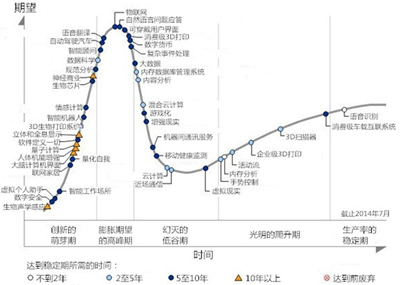 市场调研公司高德纳(Gartner)在上周发布了最新的新兴技术成熟度曲线(Hype Cycle for Emerging Technologies)。去年,大数据享有至高无上的地位,处于高德纳所说的“期望膨胀高峰期”。但现在,大数据已经跌入“幻灭的低谷期”。物联网取而代之,占据了成熟度曲线的最高点。在2012年和2013年,高德纳的分析师们认为,物联网还需要10年以上的时间才会达到“生产率稳定期”。但今年,他们认为物联网只需要5到10年时间就会达到这个最终成熟阶段。高德纳表示:“在我们、我们客户和我们合作伙伴的商业和IT版图上,物联网正成为一个充满活力的组成部分。”