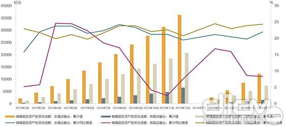 2013年-2014年5月交通运输业整体、铁路运输业、公路运输业固定资产投资及累计同比增速变化情况