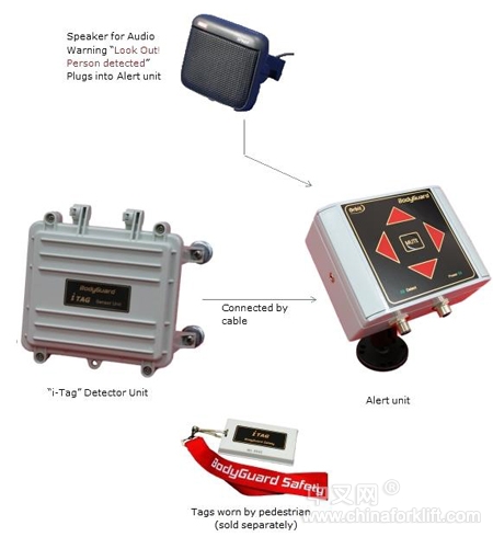 BodyGuard "i-Tag"预警系统可减少叉车和行人发生碰撞的危险。当行人进入车辆行经范围时该系统可通过预警系统来检测,可通过范围内可视物体高度识别和语音提示来防范碰撞危险。