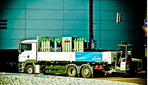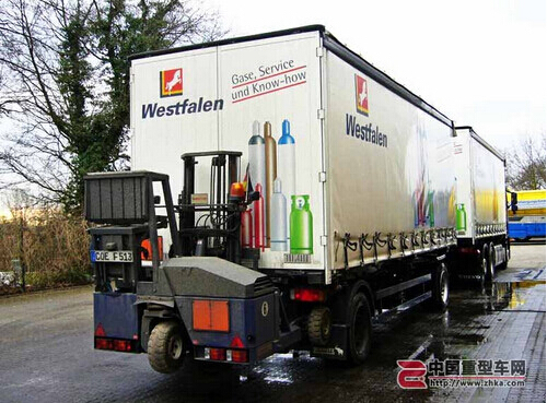 当然,除了挂车,单车也可以配备这样的随车叉车,小编朋友在出差德国的时候就拍到过林德气体的一台MAN TGS气体运输车配备叉车的照片。