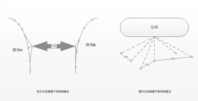 我们不妨先回到前面提及的礼俗社会这个概念,中国传统的礼俗社会得以形成并保持了三千多年的历史(从周礼开始算想必没什么争议)主要源于两点:一是以男性血缘为纽带的宗法秩序;二是自给自足的农耕文化。它强调的是一种集体感、世俗化,世俗生活的存在让人们不必像西方那样通过宗教等方式追求生命的意义。如果把人比作点,集体比作线,宗教比作面。在中国,人与人之间的关系更像是线对线之间的关系,而并非西方那种点对面对点的关系。所以在西方,由于点和点之间没有直接联系,契约只是契约,它的存在就是需要被遵守的,而东方文化的土壤上很难孕育出自己的契约精神,它的实现更多地需要借助契约到集体感的变换(时至今日,集体感已经在我们的文化中渐行渐远,所以我们很容易观察到,道德、名誉、伦理对人们的约束力越来越弱)。可以作为佐证的是,人们对集体(或曰群体)的感受往往先入为主地决定了人们对单独个体的感受,而这个个体的所作所为也往往会反过来影响人们对他所属于的整个群体的感受。(各种地域观念)