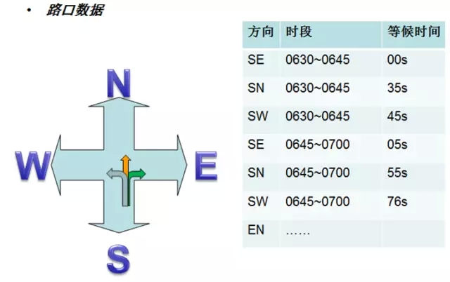 第二个是交通路口,比如路口是东西南北四个方向,每一个方向的通行效率是不一样的,直行、左拐和右拐的通行效率差别很大。所以我们在做线路规划的时候必须考虑路口的通行效率差异。右表是我们的一个统计。如右拐在早上是不用等的,但是到了高峰期以后等待时间越来越长,随着每天高峰的来临每个方向的时间也是不一样的。