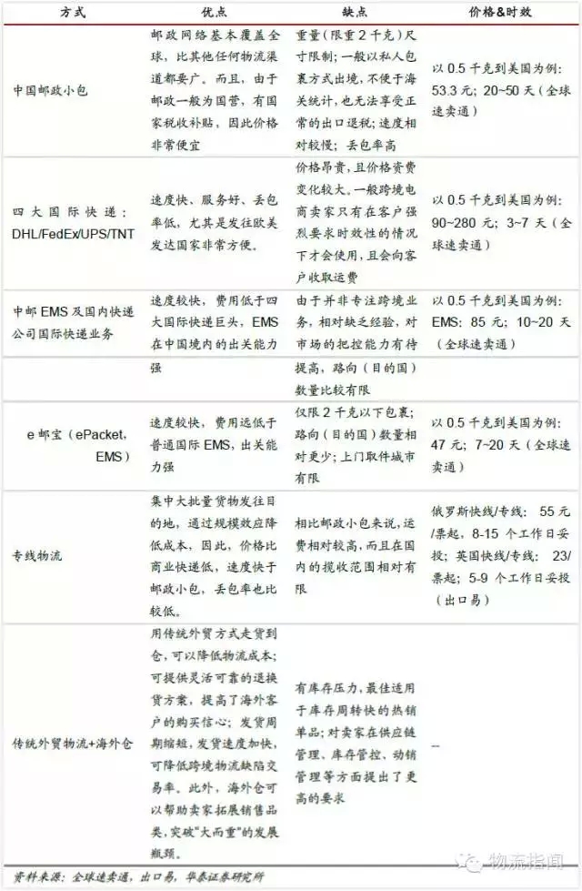 (3)专线物流。一般是通过航空包舱的方式将货物批量运输到国外,再进行目的国的派送,能够通过规模效应降低成本。根据目的地不同,专线物流可分为美国专线、欧洲专线、澳洲专线、俄罗斯专线等。专线物流通常为货运代理或物流服务提供商如出口易、燕文物流整合提供。