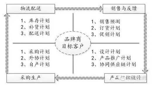 在以品牌商为核心的供应链协同运作模式中,供应链上所有参与者围绕品牌商的目标客户,在全程协同供应链计划体系下运转。销售与反馈模块分为产品上市前的销售预测、订货计划、促销计划;产品组织设计分为设计计划、产品推广计划、协同供应链计划;采购生产分为面辅料采购计划、外协生产计划、自产计划;物流配送分为库存计划、配送计划、补货计等(如图六示)。