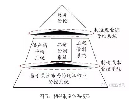 制造体系研究不同制造流程之间如何组织,生产能力如何设定,各加工工序单位产品作业时间、加工质量如何监控,以及计划如何协调等问题。成功的制造系统使得加工过程的所有步骤都相互协调,而且能维持低成本并使浪费最少(精益制造体系如图五所示)。