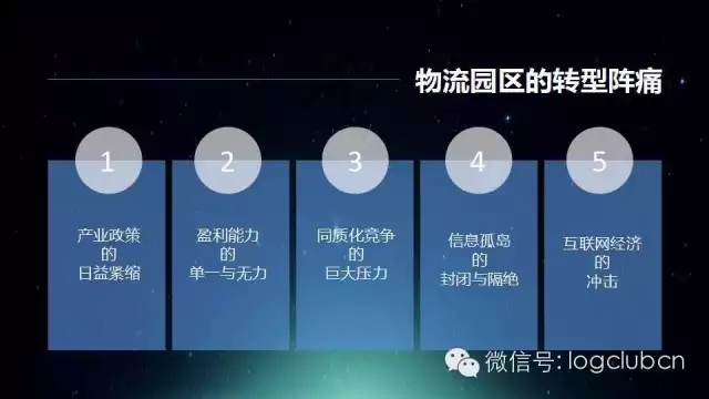 毫无疑问我们可以看到,中国的物流园区其实经历了一个艰难生成的过程。过去对于中国的村镇级的政府来说,有一句话叫做要想富先修路。对于很多农村的,毫无其他致富路径的人来说,有句话叫做要想富跑运输。由于中国最传统的运输行业是自下而上的,因此中国物流园区的发展也是自下而上的。在最开始的时候,中国的物流园区更多的是一个几乎没有被规划过的停车场,加上几排土房子,加上一些信息部,构成了一个以停车、配货为基本职能的物流园区,这是最原始的模型。随着城市发展、城市规划的进程,开始有了物流园区的规划,开始有了很多高大上的物流园区,开始有了很多看起来很漂亮的物流园区。但目前无论什么样的物流园区,我们认为其基本的模式就是物流地产,或者说其实就等于房地产开发商加上物业管理者,园区是靠物理载体来吸引信息或者吸引车流,使他所拥有的物业达到增值的目的。这个时候我们会发现,当有一天互联网来临的时候,当城市规划重新调整的时候,物流园区可能开始有一些思考。过去政府非常喜欢物流园区,用地规模很多,看起来产业规模也很大。毫无疑问,物流园区曾经承载了一个城市不可或缺的产业功能,但是随着物流园区的面积越来越大,它几乎成为了一个城市的不愿面对的话题,城市的生态、环境、交通问题都跟物流园区联系在了一起,这个时候政府的脸色没那么好看了。在这个过程当中,物流园区由于地产的基本模式,以及地产的基本盈利途径,发现几乎所有园区的盈利都是很单一的,没有多元化的盈利方式。在这个过程当中,由于盈利的单一,使得中国的物流园区,几乎最终都会走向同质化的竞争环境。由于在这样的竞争环境下,园区希望把更多的企业通过物理集合的方式整合在这个物理载体里面,甚至当互联网来临的时候出现了这样的一些说法,说互联网会革物流园的命,但是我们说这完全是一个伪命题,为什么这么讲呢?因为互联网在过去若干年的时间里面,其实一直没有革过在任何一个产业链上创造价值的环节的命。因此对物流园区来说,最核心的不是说会被互联网革掉,而是作为物流园区如何在这个环境下利用互联网,使得自己成为互联网化的一部分,使得自己真正的融入互联网,使得自己有机会在产业链上创造更大的价值。