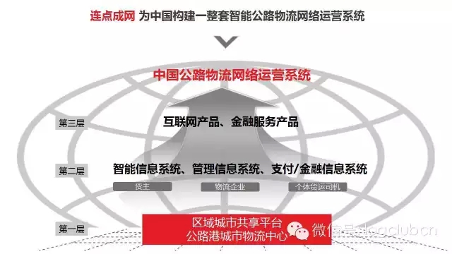 第二层我们就觉得它应该配备一定的智能系统,智能管理系统以及支付系统,诚信系统等等,同时要全系统打通,这就方便整个物流运输业务的操作以及整个信息化透明的过程。他可能就会涉及到货主,或者说物流企业还有我们的个体司机。