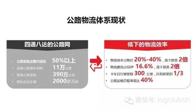 那么这个运输市场到底是什么样的?我们传化一直是立足于打造中国公路物流的第四方平台,我们觉得整个行业的一个行业的领导者才能称之为第四方物流平台。这个行业到底是什么样的?就是公路物流运输业的一个现状是什么样呢?大家知道中国公路建设了11万公里高速公路,并且有390万公里的等级公路,这个市场的总投资额是超过百亿级的,但是恰恰没有一个枢纽共享平台和一个系统的支持。我们为什么一直说中国的物价贵,其实物流在里面的占比成本非常高,整个物流的成本会占比物价的20%到40%,有些东西当你买回手的时候,其中40%的钱是花给了物流,这个大家要知道,欧美国家的这项比例只有7%到8%。我们的物流费用是占GDP的16.6%,高于欧美的2倍,我们的卡车日行公里数是300公里,只有美国的三分之一,这个是一个社会的现状,我相信这也是在座好多人说我愿意做物流的一个根本性的原因。因为我把数据都列在那儿,大家都知道只要砍掉1%,就是一个百亿级的市场。
