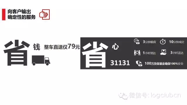 这也是我们一直在坚守的一个标准,就是给客户带来两个词,省钱和省心。我们说整车直送只要79元,我们现在一直在做的是整车业务。为什么我们选择坚守做一年的整车业务,是因为我们觉得所谓现在市场上很多企业所说的,我可以按方计费或者零担拼车这样的,但是你无法保证你车上每一个用户,最终货物到达他手里的时间。我假设一个时间,就是一个车如果他能承载5个方,那么每个客户1个方,请问第五个客户什么时候能拿到他的货物。大家可能都做过物流,应该都清楚,如果前面的不仅仅是路程的耽误,或者说装卸时间的耽误,有可能导致第五个客户今天晚上24点之前都拿不到这个货。所以为了提高用户体验,这样做可能很傻,但是我们坚持的就是,我要保证我们的客户第一时间体验,就是你会在第一时间体验到这样的一个车,并且我们的车会第一时间把货物送到相应的客户手里,这才是最好的。第二就是我们一直承诺的是“31131”这样的一个服务口号,我们是在客户下单3分钟的时候,就会有车辆跟他响应。在10分钟的时候就会有成交,一个小时的时候我们的车辆会到达客户的门口,3个小时会把这个货送到全城任何地方。如果出了问题100%赔付,这个是传化物流能做到的,我相信传化物流可能不止500万来做这个事情,也可能是一个亿,这个都有可能。