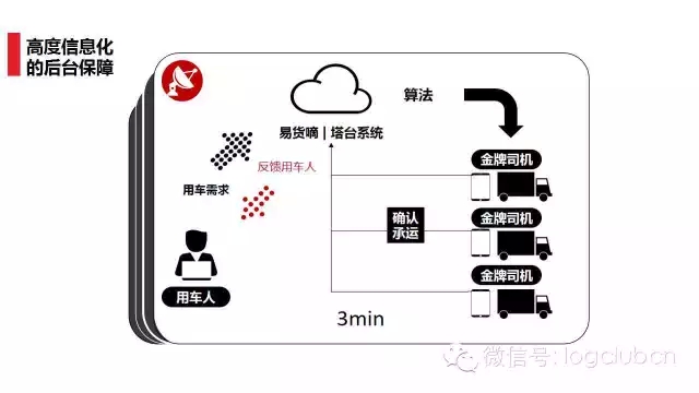 我们还往前做的,因为我们还有第三层,从传化物流的角度来讲我们还有第三层。易货嘀携手2个合作伙伴,一个是中国人保,我们平台上所有承担的货物全部进行全程保险,并且进行一个赔付。另一个是中国银联合作,如果你的运费是走的我们线上支付平台,并且支付成交的。不但可以享受我们所有平台上面的优惠,同时我们会对你的运费做出相应的保障。在货物没有到达你制定的地点之前,运费是不会付给司机的,这个是100%保证的。第二,如果说出现司机违约,就是说司机放空你,不好意思,我们赔付你此次运费的50%,并且重新给你叫一辆车,这个是我们能做到的,我相信其他企业也是做不到的。