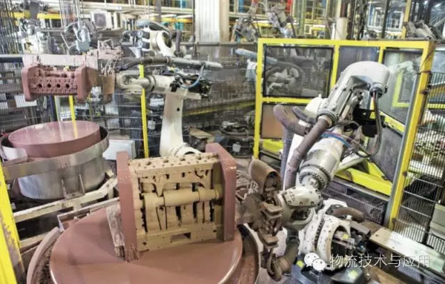 组装线上的第一台机器人是KR QUANTEC铸造版机器人。机器人从制芯机中取出全套的砂芯组件,然后将它们放到1号和2号转台上。这些转台随后旋转180度到较小的KR 5arc机器人面前进行组装和去除毛刺。当两个转台都转回原位时,另外3台KR QUANTEC系列的KUKA机器人拾起每个砂芯并将它们放在3号转台上,以便进行下一步的部件装配。再次旋转180度后,另两台KR 300型机器人将完全组装好的整个组件放置好。下一个机器人取走组件并将其移至固定的螺栓紧固站下面。螺栓拧紧后,六轴机器人将组件放在4号转台上,接着旋转将完全组装好的组件送至清洗室进行清洗并沥干,这里由2台KR300型机器人同时负责。清洗完的组件再次被放至转台上旋转90度,送至人工检查站,等工人检查核准后,总装配的最后一个机器人拾起组件并将其放到一个带有8个格子的货架上。待货架上摆满清洗过的湿组件后,货架被送至烘干炉,最后摆放在高货架仓库中的成品区相应的位置。
