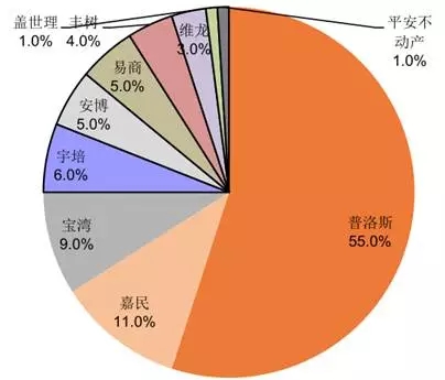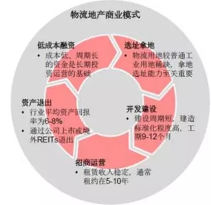 从物流地产的商业模式来看,包括融资、选址拿地、开发建设、招商运营和资本退出几个阶段。其中低成本融资能力、 拿地选址能力及退出渠道是衡量一家物流地产商竞争力的重要指标。 目前市场主流物流地产商均会成立物流地产基金, 在项目初期通过基金模式放大杠杆提供资金支持, 在项目后期将成熟的物流仓储项目出售给基金或第三方, 实现物业销售开发收入的提前兑现和项目的轻资产运营。目前国内最大物流地产商为普洛斯,2015 年市场份额达到 55%。